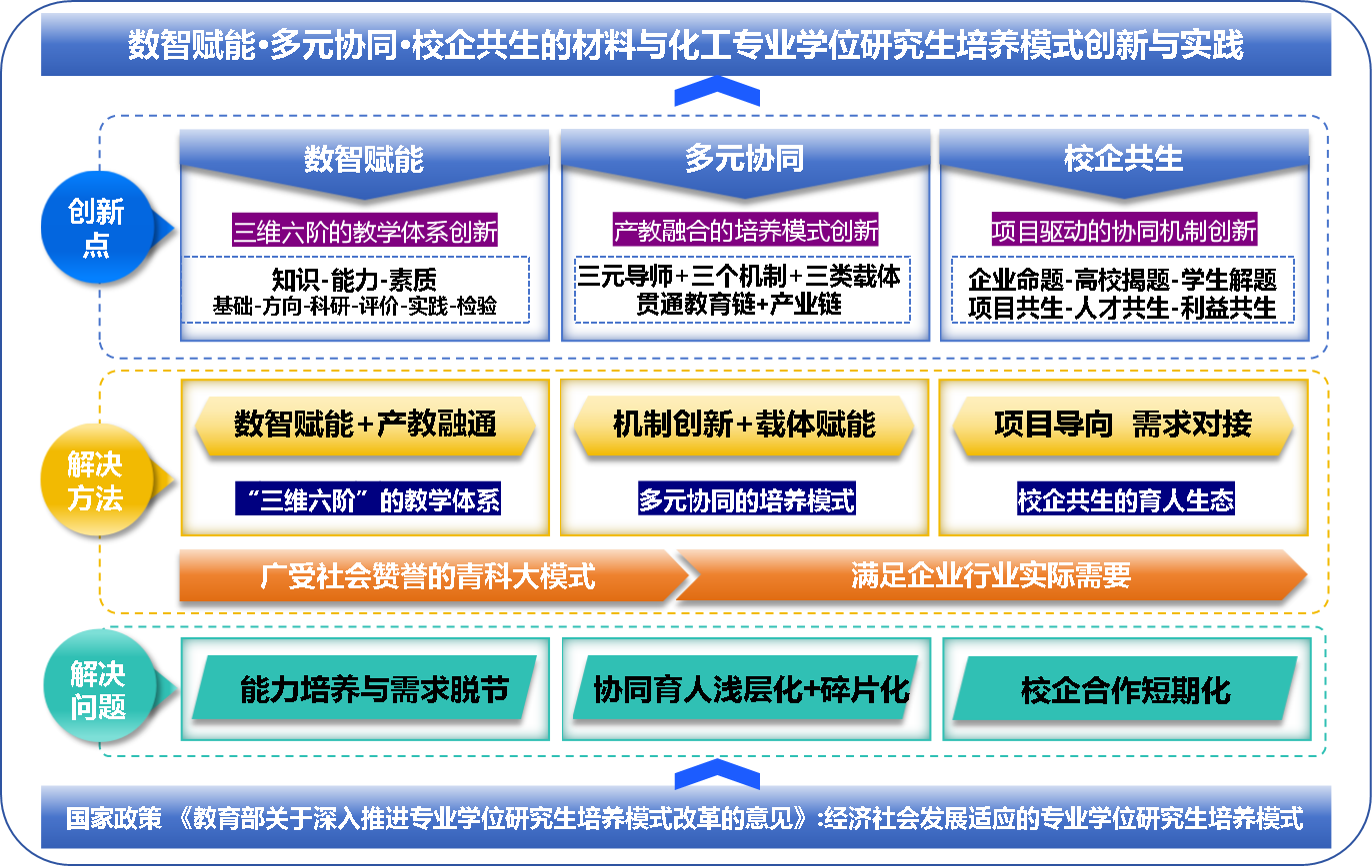 2013年,教育部提出“建立职业需求导向、实践能力培养、产学深度结合,与经济社会发展适应的专业学位研究生培养模式”,作为青岛科技大学立校之基的材料与化工专业,自2014年起依托《全日制专业硕士研究生多元化培养机制探索研究-以化学工程专业为例》省级教育创新项目,秉持“化育天工,造材筑梦”育人理念,通过数智赋能、多元协同、校企共生的教学改革创新,培养了一大批高素质材料与化工专业人才。